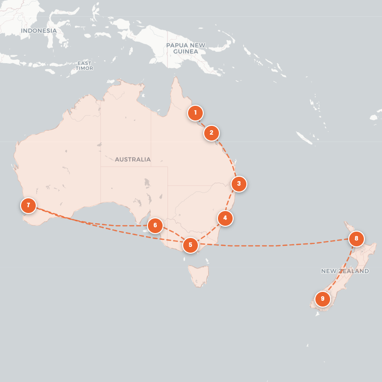 Your host meets you at arrivals in Cairns. You drive into town, check in, take a quick shower, and meet the other Pioneers (a small group, usually 8-12 people) for a first drink before heading out for dinner. It's the first meal together. Nobody knows each other yet, but that changes fast. Within an hour you're hearing about someone's ceramics studio back home and why another person finally left their job last spring. Cairns itself sits in tropical North Queensland—Australia's gateway to the Great Barrier Reef—hot, humid, entry point to reef and rainforest. The reef's dying but it's still worth seeing—boats leave daily, you'll snorkel over coral, see tropical fish, understand what climate change actually means. Daintree is the world's oldest rainforest—135 million years, walk the canopy boardwalks at your own pace, swim in Mossman Gorge if the crocodiles aren't around. The esplanade has a lagoon because the ocean has box jellyfish October-May (they'll kill you). Cairns runs hot—30+ degrees, humid, you'll sweat just standing still. Night markets, decent food, backpacker energy even though you're not backpackers anymore.