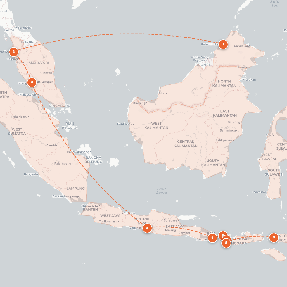 Three months moving through Indonesia, Malaysia and Borneo. Solo travelers who travel together—designed for people with time, curiosity, and zero interest in tours or packages. Orangutans in actual jungle, not sanctuaries.